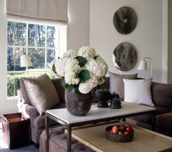 Not only is layering furniture a way to deal with limited space and provide versatility to meet various entertaining needs, it is also an effective strategy to provide visual interest and a focal point in an otherwise simple space. I like how the large ottoman (often a signature piece for Wolf) is the only pattern in the room. It is also a way to move circular shapes around an otherwise rectangular space.